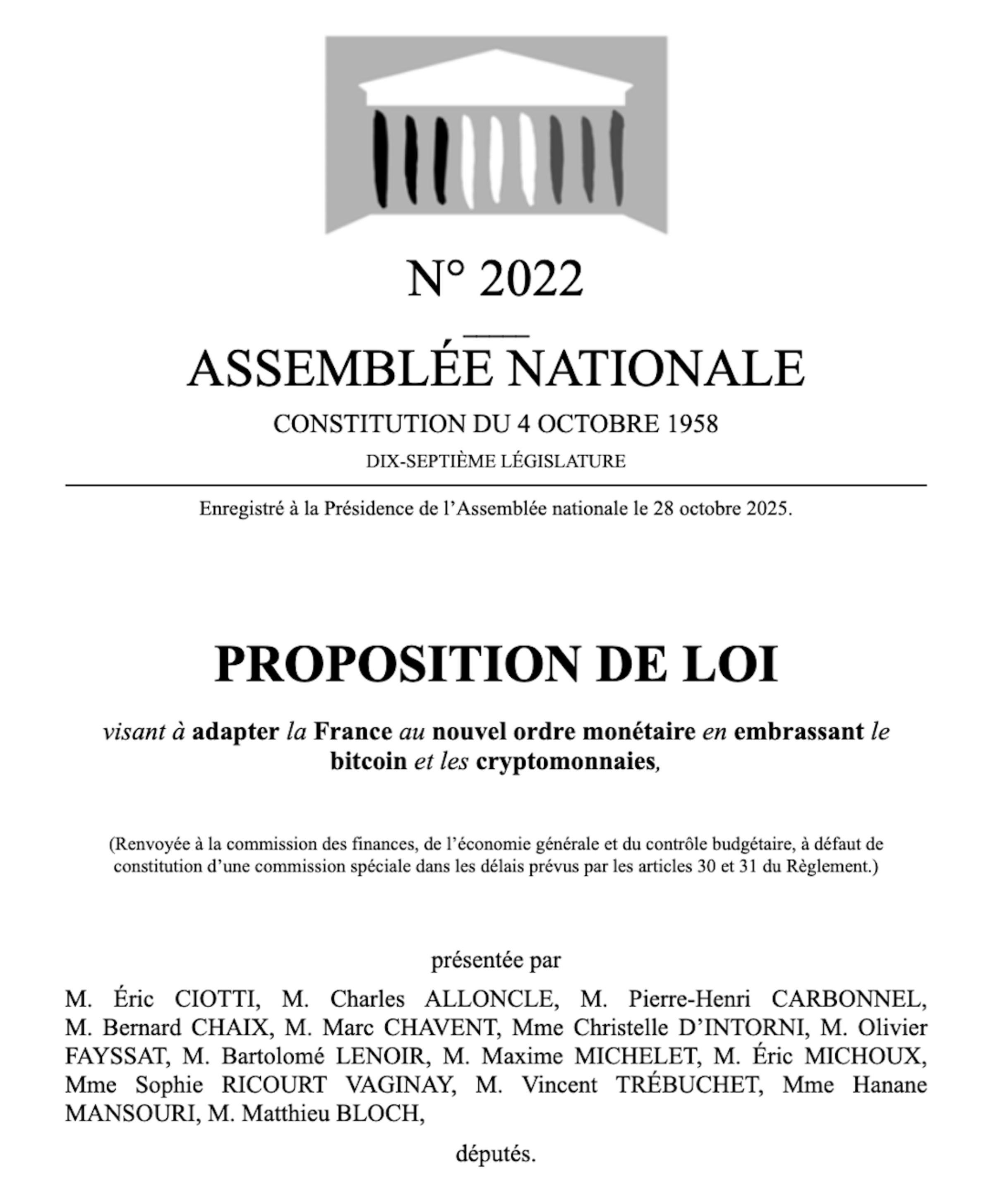 Nachdem französische Abgeordnete bereits im Juli 2025 mit einem Gesetzentwurf die Nutzung überschüssiger Atom- und Wasserkraft für Bitcoin-Mining anregten, geht die Union de la Droite (UDR) mit Gesetzentwurf Nr. 2022 nun deutlich weiter:
