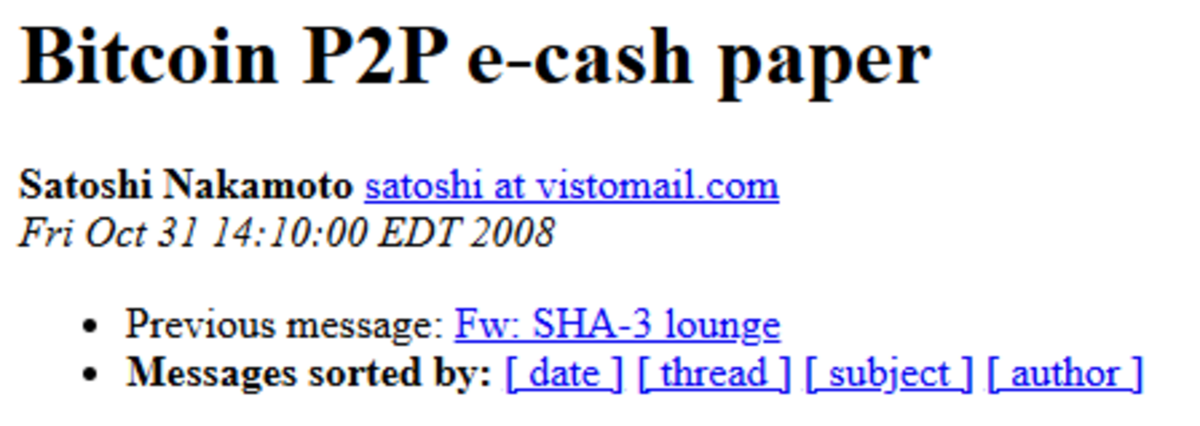 Am 31. Oktober 2008 um genau 19:10 Uhr deutscher Zeit teilte eine Person(engruppe) unter dem Pseudonym Satoshi Nakamoto ein Dokument, das die Finanzwelt für immer verändern sollte. In einer E-Mail an die Kryptografie-Mailingliste von metzdowd.com enthüllte Satoshi das Bitcoin-Whitepaper – eine visionäre Idee eines dezentralen Peer-to-Peer-Zahlungssystems ohne die Notwendigkeit von Mittelmännern wie Banken.