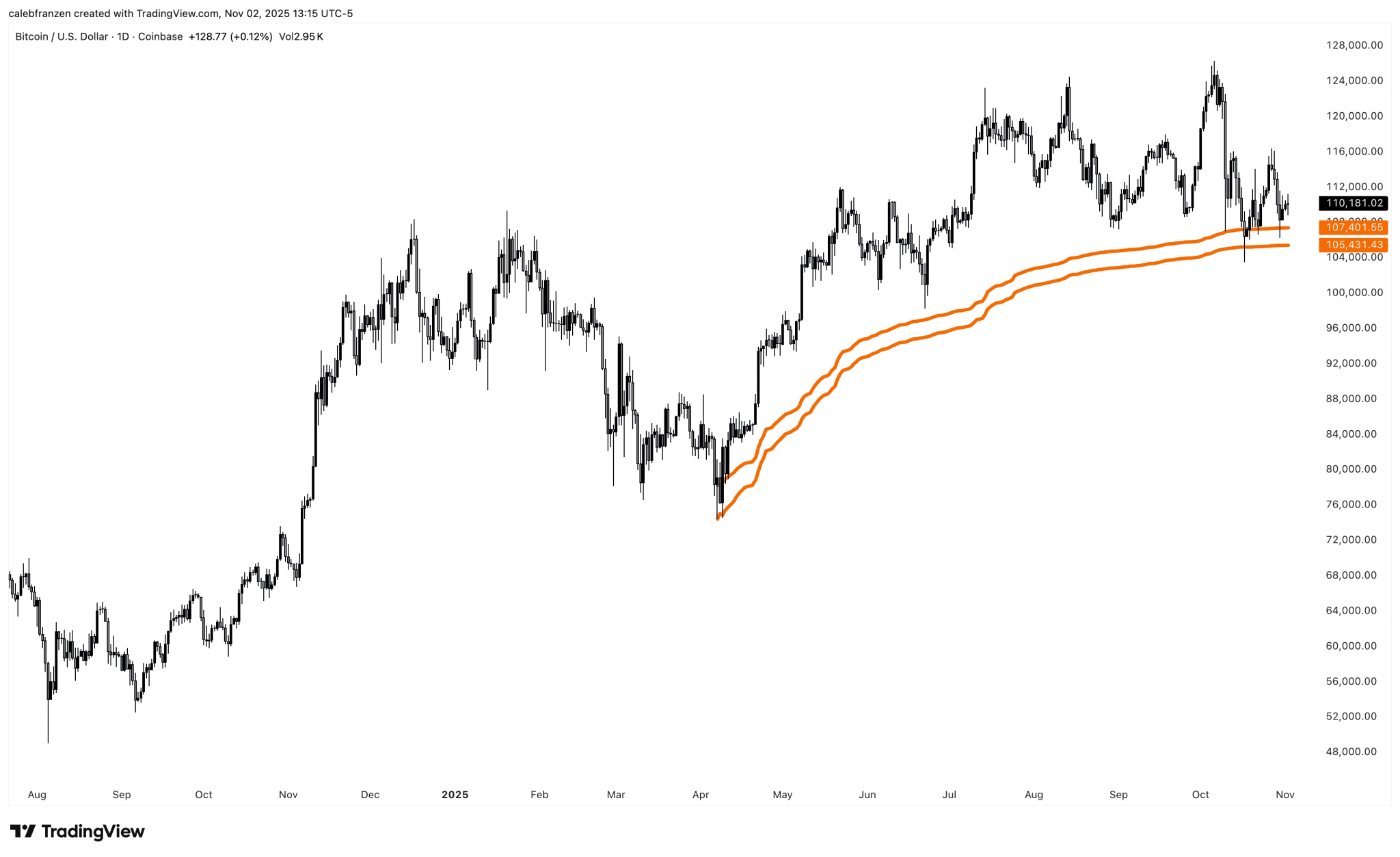 In der Grafik unten sehen wir, wie Bitcoin Unterstützung vom durchschnittlichen, nach Handelsvolumen gewichteten Kurs (AVWAP) seit April 2025 erhält.