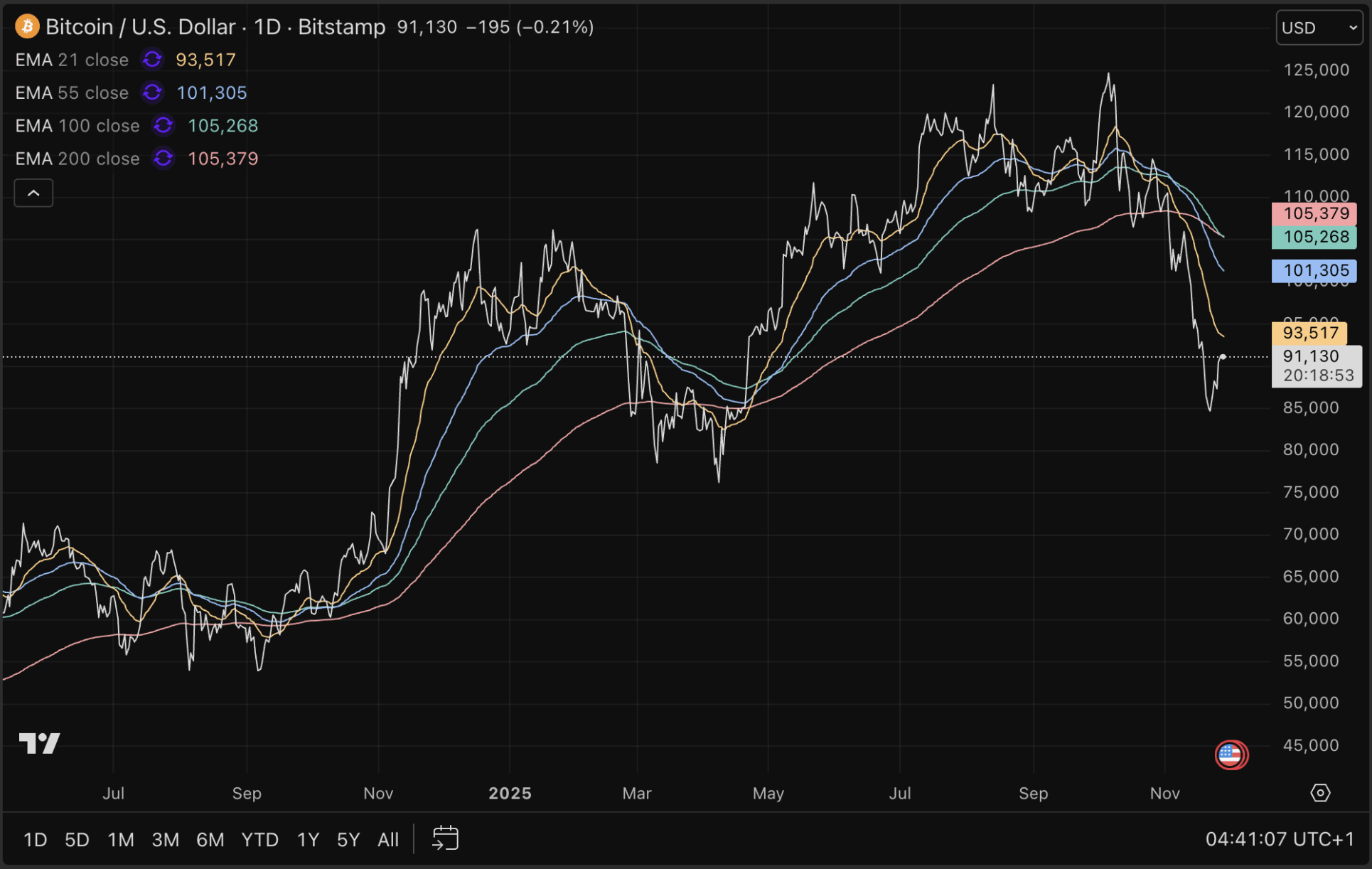 Man könnte sagen, dass Bitcoin derzeit in großen Höhen auf einem schmalen Grat balanciert. In den vergangenen Wochen hatten klar die Bären das Sagen und drückten den Kurs nach unten. Hauptgrund dafür war die restriktive Haltung der US-Notenbank im Oktober, die offen Zweifel an einer Zinssenkung im Dezember geäußert hatte.