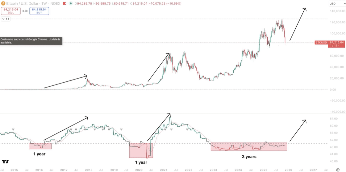 Auch diesmal ähneln viele Indikatoren diesem Punkt. Bärische MACD-Signale, gebrochene gleitende Durchschnitte, ein sentimentgetriebener Ausverkauf und die völlige Aufgabe vieler Anleger. Der entscheidende Unterschied zu 2021: nun kommt die Liquidität von ganz unten. Die Federal Reserve steht kurz vor dem Ende der Straffung. Die nächsten Lockerungsschritte könnten bereits im Dezember folgen. Und Bitcoin hat in seiner gesamten Geschichte noch nie eine lange Abwärtsphase begonnen, genau in dem Moment, in dem die Liquidität von Knappheit zurück in Expansion kippt.