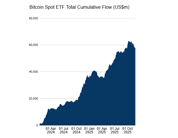 Noch immer Sind 57,6 Milliarden in Bitcoin Spot ETFs, Quelle: https://farside.co.uk/btc/