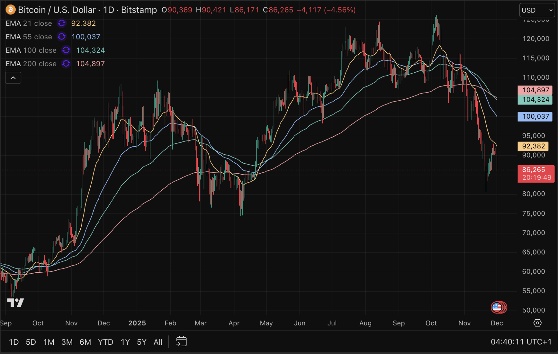 Im Chart oben ist zu sehen, dass Bitcoin – ähnlich wie Anfang 2025 – unter mehrere wichtige gleitende Durchschnitte gefallen ist. Aktuell wirkt sogar der 21-tägige exponentielle Durchschnitt des Kurses als Widerstand für Bitcoin.