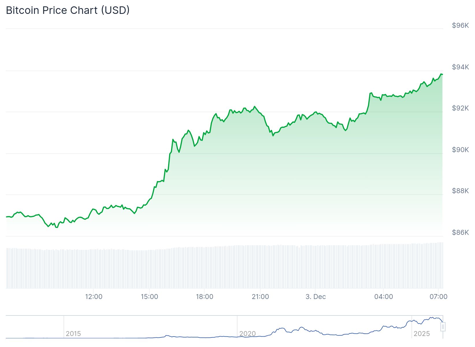 In der Nacht ist er weitergeklettert, und mittlerweile rückt die Marke von 94.000 US-Dollar wieder in greifbare Nähe. Diesen Kursstand haben wir zuletzt am Montag, dem 17. November, gesehen.