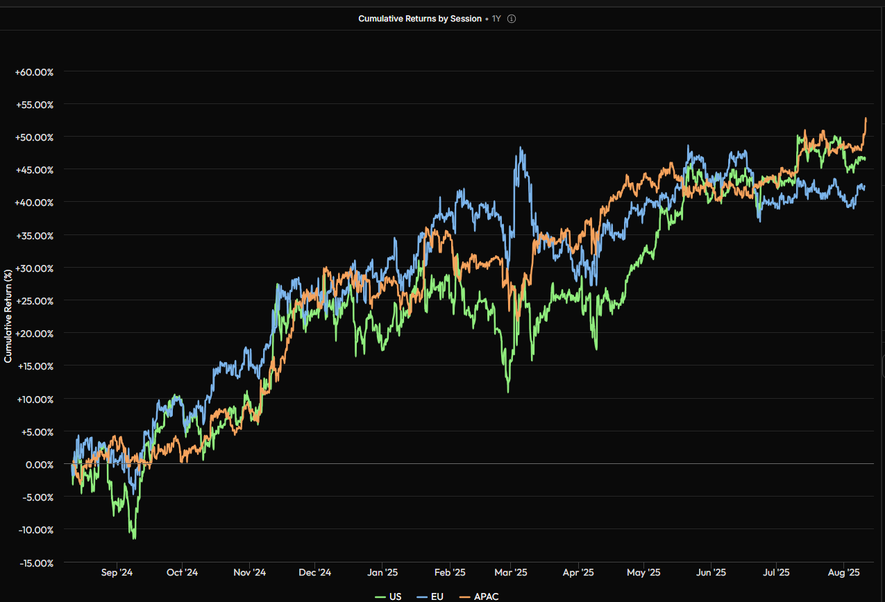 Seit August 2025 erzielten die asiatischen Handelssitzungen die größten Gewinne, während die US-amerikanischen und europäischen Märkte überwiegend tägliche Kursverluste mit aktiven Verkäufen verzeichneten.