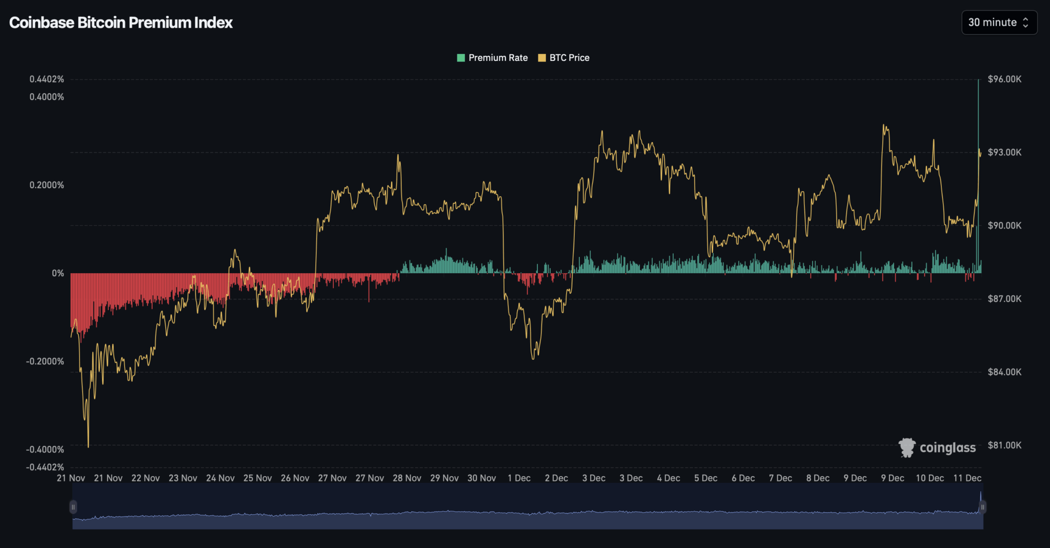 Nach einer nahelos durchweg roten November ist der Index im Dezember erstmals wieder in den positiven Bereich gedreht. Aktuell gar neun Tage in Folge positiv – ein Hinweis darauf, dass US-Investoren wieder bereit sind, leicht höhere Kurse auf Coinbase zu zahlen als der Rest der Welt.