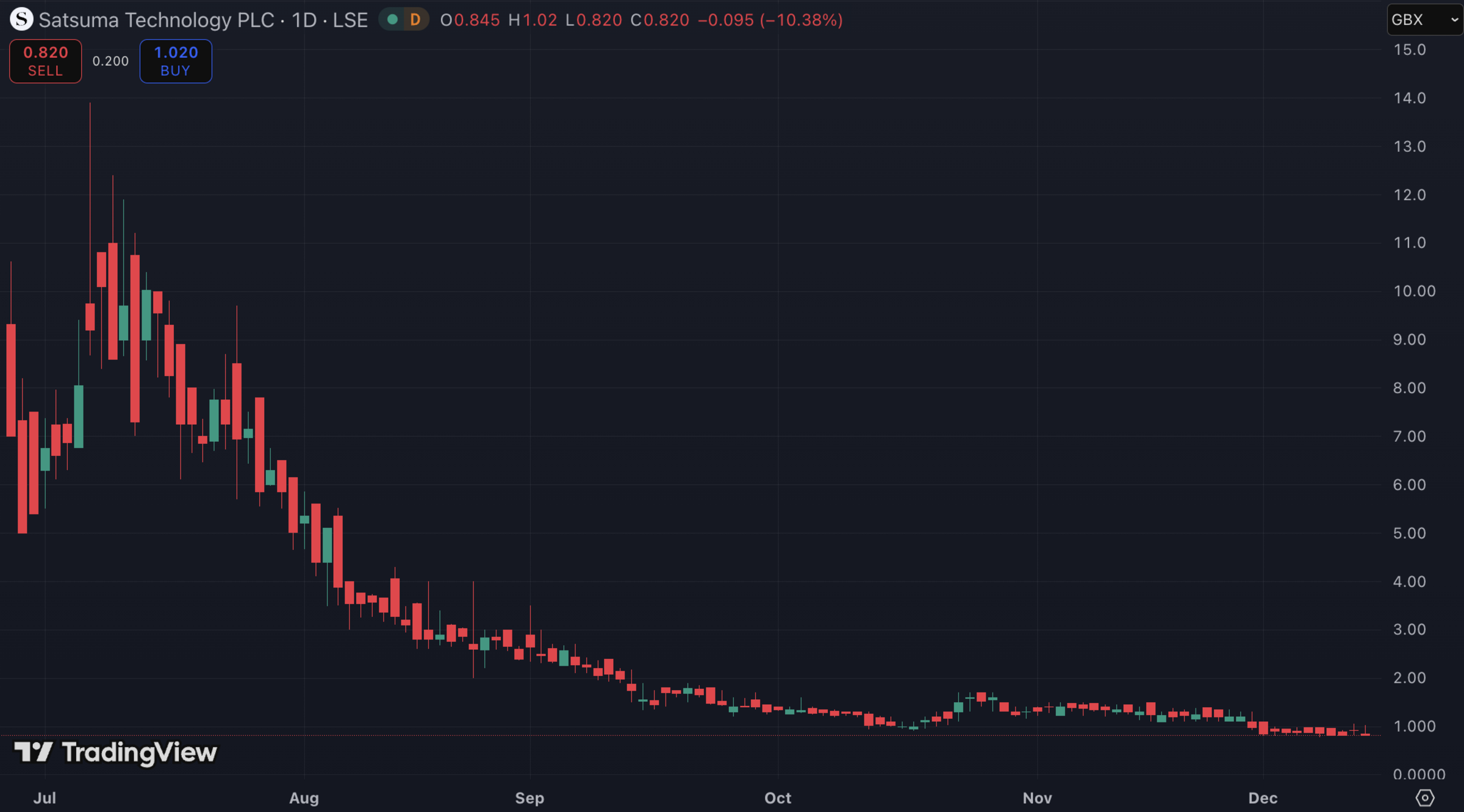 Satsuma Technology hält jetzt noch 620 BTC im Gegenwert von mehr als 40 Millionen Pfund (57 Millionen US-Dollar), womit es auf der Liste der Aktiengesellschaften mit Bitcoin auf der Bilanz, Platz 60 einnimmt, wie die Daten von bitcointreasuries.net zeigen.