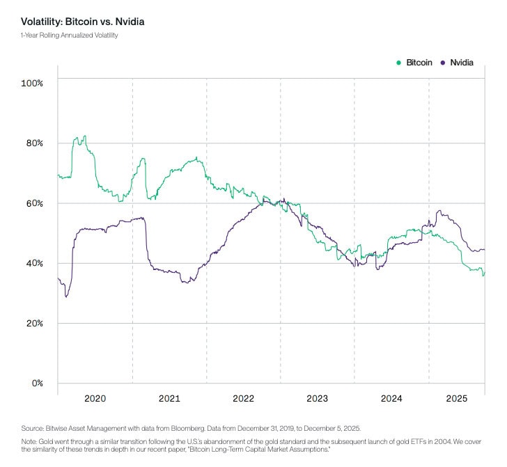 • Zugleich erwartet Bitwise einen Rückgang der Volatilität. Bitcoin sei 2025 zeitweise weniger volatil gewesen als die Nvidia-Aktie. “Die Volatilität von Bitcoin ist in den vergangenen zehn Jahren kontinuierlich gesunken”, so die Analysten. Ursache sei die breitere Investorenbasis durch regulierte Produkte wie ETFs, ein Trend, der sich fortsetzen dürfte.