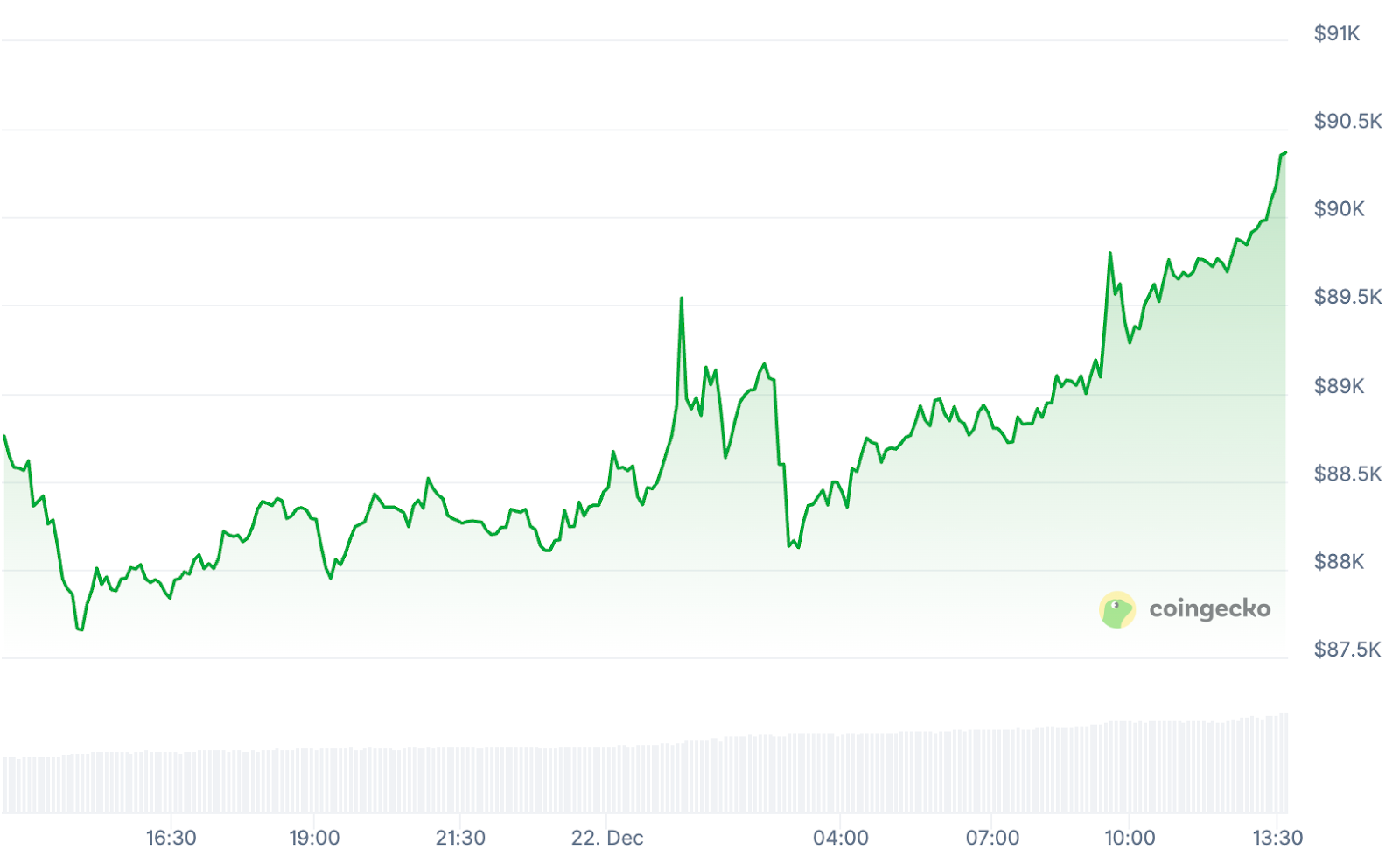 Während das Jahresende näher rückt, steigt die Spannung: Beenden wir das Jahr mit einem Durchbruch oder einer Enttäuschung? Bitcoin (BTC) hat heute jedenfalls wieder an Boden gewonnen und liegt erneut über der entscheidenden Marke von 90.000 Dollar.