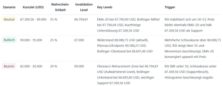Kurzfristig bleibt die Prognose neutral bis leicht bullisch: Kurs über EMA-20, Momentum abgeschwächt. Unterstützung sieht man bei 87.369,56 US-Dollar, unmittelbarer Widerstand bei 88.088,75 US-Dollar, weiter bei 90.588,23 US-Dollar. Ein stabiler Schlusskurs über 88.088,75 US-Dollar würde Raum bis ~90.588,23 US-Dollar öffnen; ein Bruch unter 87.369,56 US-Dollar dürfte Abwärtsdruck bis zur Fibonacci-Zone bei 86.794,81 US-Dollar auslösen.