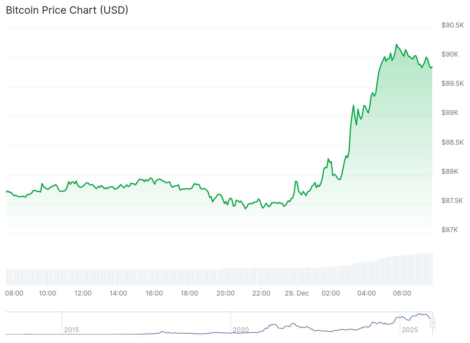 Während du höchstwahrscheinlich auf einem Ohr lagst, hat Bitcoin (BTC) ordentlich zugelegt. Der Kurs ist in wenigen Stunden von 87.500 Dollar auf knapp über 90.000 Dollar gestiegen. Das entspricht einem Gewinn von fast drei Prozent.