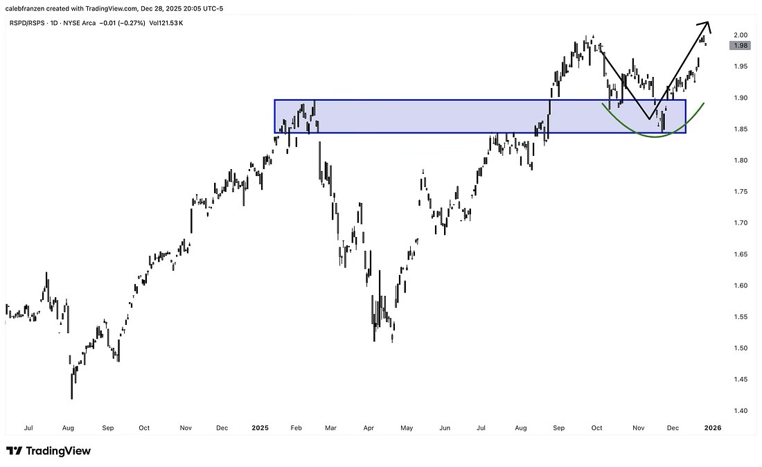 Das sehen wir zum Beispiel im Verhältnis zwischen den RSPD- und PSPS-ETFs. Ersterer bezieht sich auf Unternehmen, die nicht-essentielle Konsumausgaben ermöglichen. Dazu gehören Autos, Reisen, Luxus und Einzelhandel. Während PSPS die Grundbedürfnisse wie Lebensmittel, Getränke und Haushaltsprodukte abdeckt.