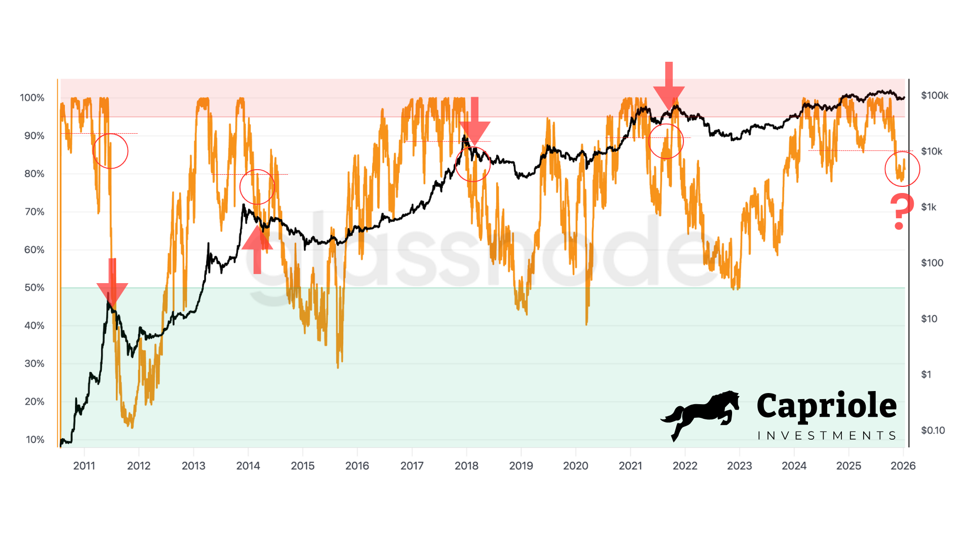 Der zweite Hauptgrund sei die Profitabilität im Netzwerk. In ausgeprägten Bullenphasen liegt der prozentuale Anteil von Bitcoin-Adressen im Gewinn typischerweise über 80 bis 90 Prozent. Kritisch werde es laut Edwards, wenn der Indikator strukturell bricht und Re-Tests scheitern. Genau dies passiert aber momentan: