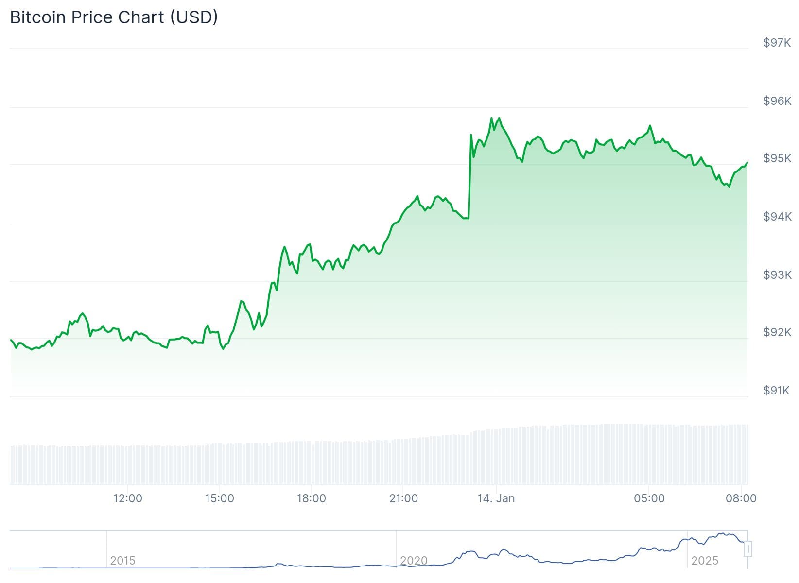 Zum Zeitpunkt des Schreibens steht der Bitcoin-Kurs an der Kryptobörse Coinbase bei 94.955 Dollar. An der Kryptobörse Bitpanda liegt der BTC-Preis in Euro damit bei 81.505. Im Vergleich zu vor 24 Stunden steht BTC 3,03 Prozent im Plus.