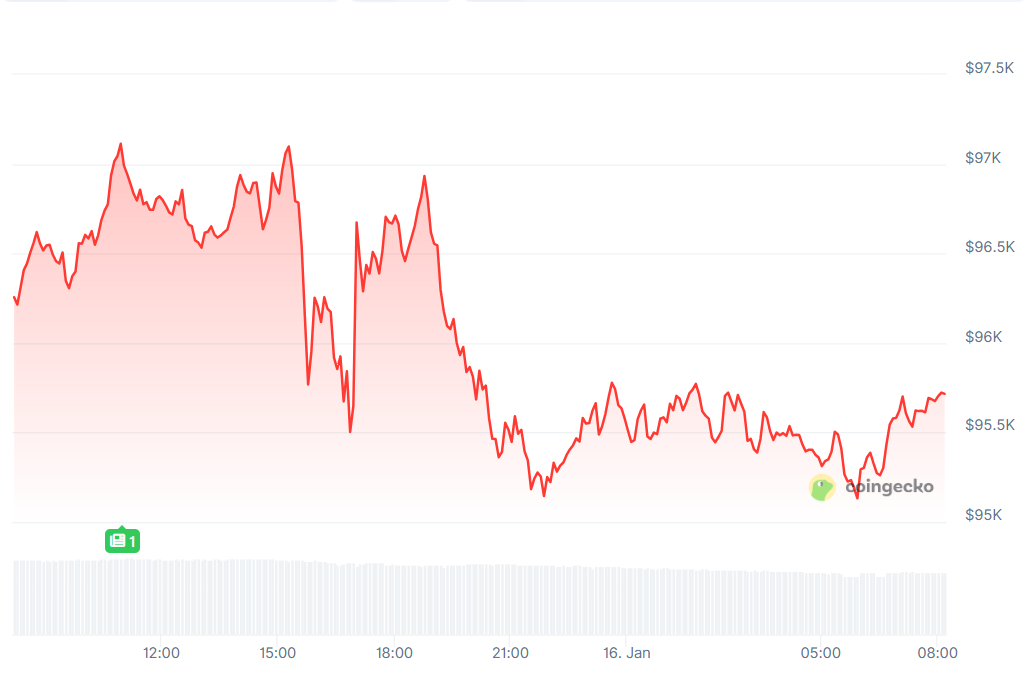 Danach konnte Bitcoin auf 97.000 Dollar hochklettern, aber nachdem die amerikanischen Aktienbörsen öffneten, war kein Halten mehr. Der Kurs machte einen scharfen Sturzflug auf einen Tiefpunkt von etwa 95.400 Dollar.
