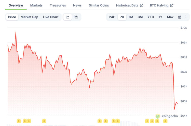 Am Samstag stieg der Bitcoin-Kurs kurz in Richtung 68.600 Dollar, aber diese Gewinne verschwanden schnell wieder. Am Montag gegen 01:00 Uhr fiel der Kurs um mehr als vier Prozent auf etwa 64.300 Dollar. Bitcoin liegt damit nun etwa 48 Prozent unter dem Höchststand vom Oktober 2025.