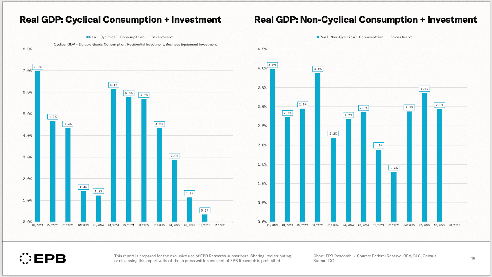 Die tatsächlichen Schwankungen im Wirtschaftszzyklus stammen laut EPB Research aus lediglich drei Kategorien innerhalb des BIP-Gesamtbilds.