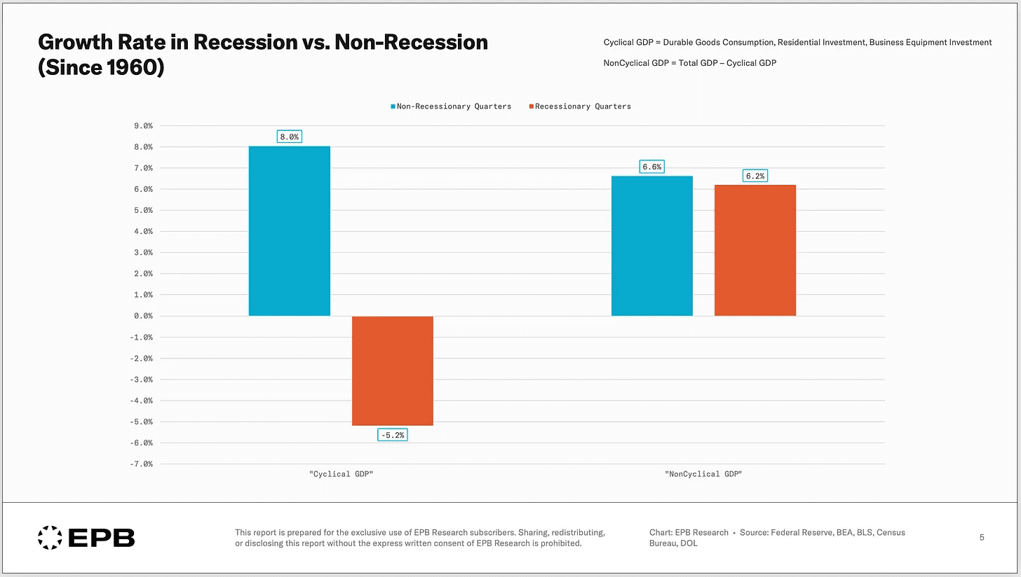 Das zyklische Segment der Wirtschaft bildet das Signal, während der nicht-zyklische Teil hauptsächlich Rauschen ist. Dies zeigt sich am stärksten in der folgenden Grafik. Während das zyklische Segment in rezessionsfreien Zeiten stark wächst und während Rezessionen schrumpft, wächst es immer. Auch während einer Rezession.