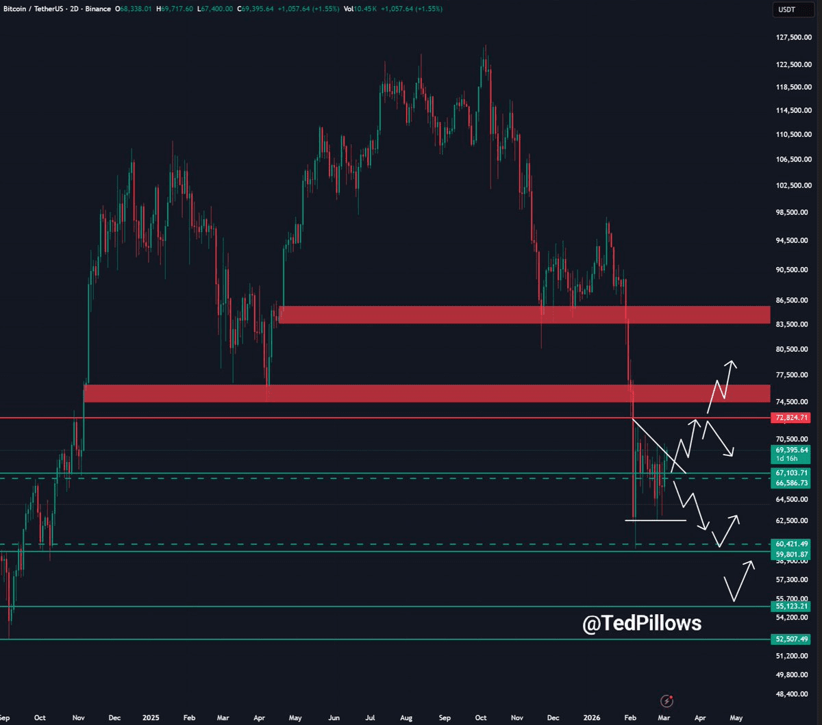 Sollte es Bitcoin nicht gelingen, sich über 70.000 Dollar zu halten, erwartet der beliebte Analyst Ted Pillows einen erneuten Test der Kurszone von 65.000 bis 66.000 Dollar.
