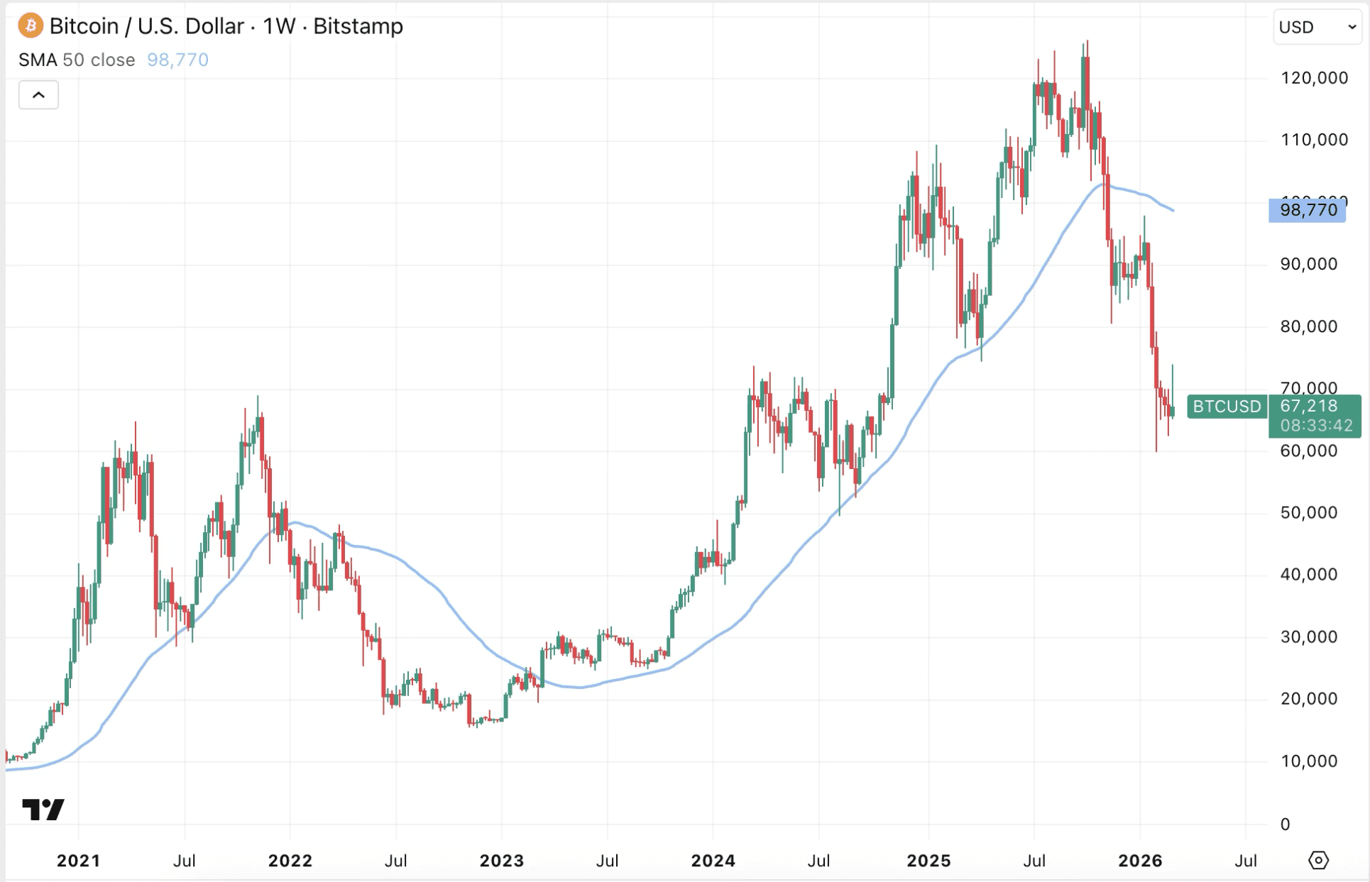 Interessanterweise liegt dieser Durchschnitt derzeit bei 98.770 Dollar für Bitcoin. Dieser Kurs wurde während der zweiten Januarwoche kurz erreicht, bevor der Abwärtstrend fortgesetzt wurde und im Februar mit einem vorläufigen Tief von 60.000 Dollar endete.