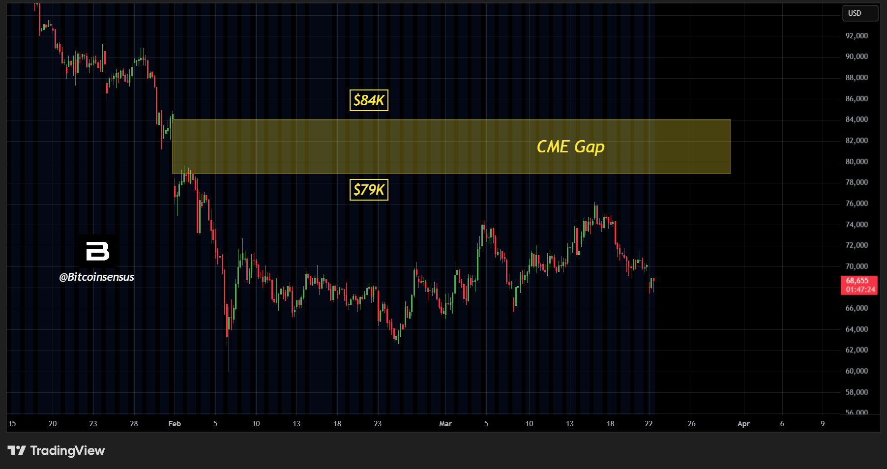 Dieses Band ist die unmittelbare Grenze. Darunter stützt sich Bitcoin technisch gesehen auf Channel-Unterstützung, anstatt auf eigenen Beinen zu stehen. Die Widerstandszone von den Hochs Mitte März liegt bei 73.500 bis 74.000 US-Dollar, wobei die obere Kanalgrenze nahe 75.000 $ darüber liegt.