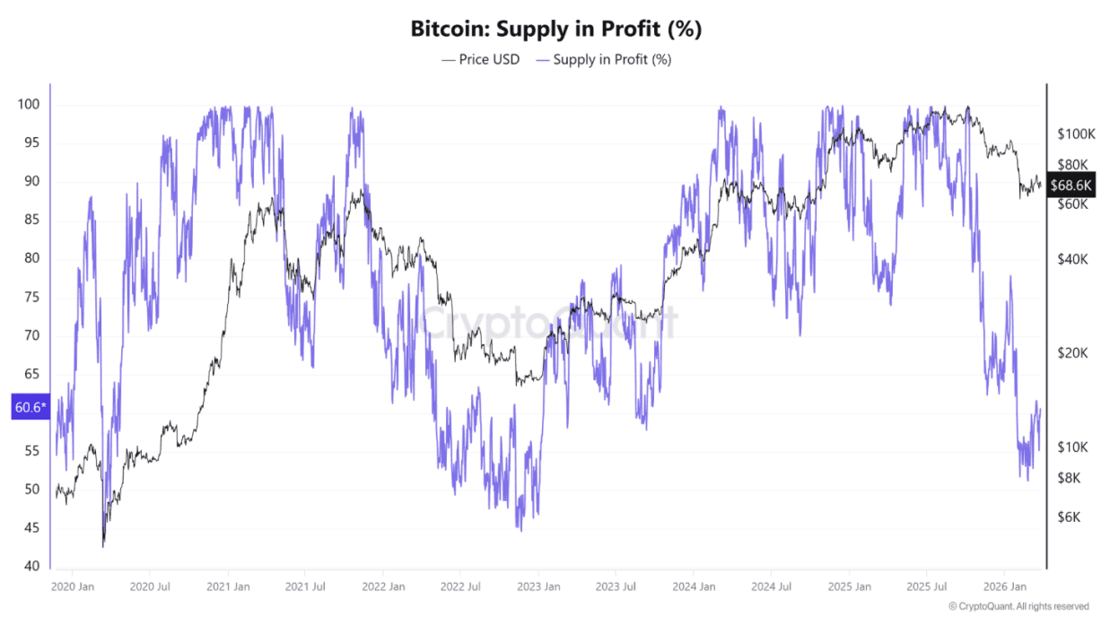 Aktuell befinden sich etwa 60 Prozent der im Umlauf befindlichen Bitcoins im Gewinn, wie Daten von CryptoQuant zeigen. Im vergangenen Monat fiel dieser Wert sogar auf nahezu 50 Prozent. Historisch deuteten solche niedrigen Werte meist darauf hin, dass sich der Markt nahe eines Bodens befindet.