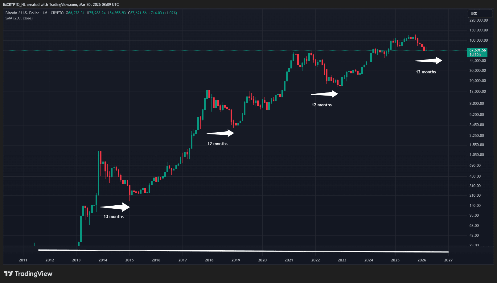 In vorherigen Zyklen erreichte Bitcoin immer drei bis vier Monate später seinen Tiefpunkt. Sollte sich die Geschichte wiederholen, könnte das Leid bis Ende des Sommers gelitten sein.