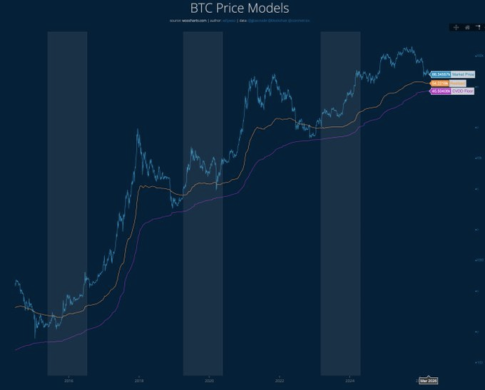 Der On-Chain-Analyst Willy Woo erklärte, dass traditionelle Bewertungsmodelle einen Bitcoin-Boden zwischen 46.000 und 54.000 US-Dollar zeigen. Diese Modelle integrieren Kennzahlen wie Active Price und Cointime Price, die die Gesamttransaktionsaktivität bzw. die Kostenbasis des langfristigen Inhabers abbilden.