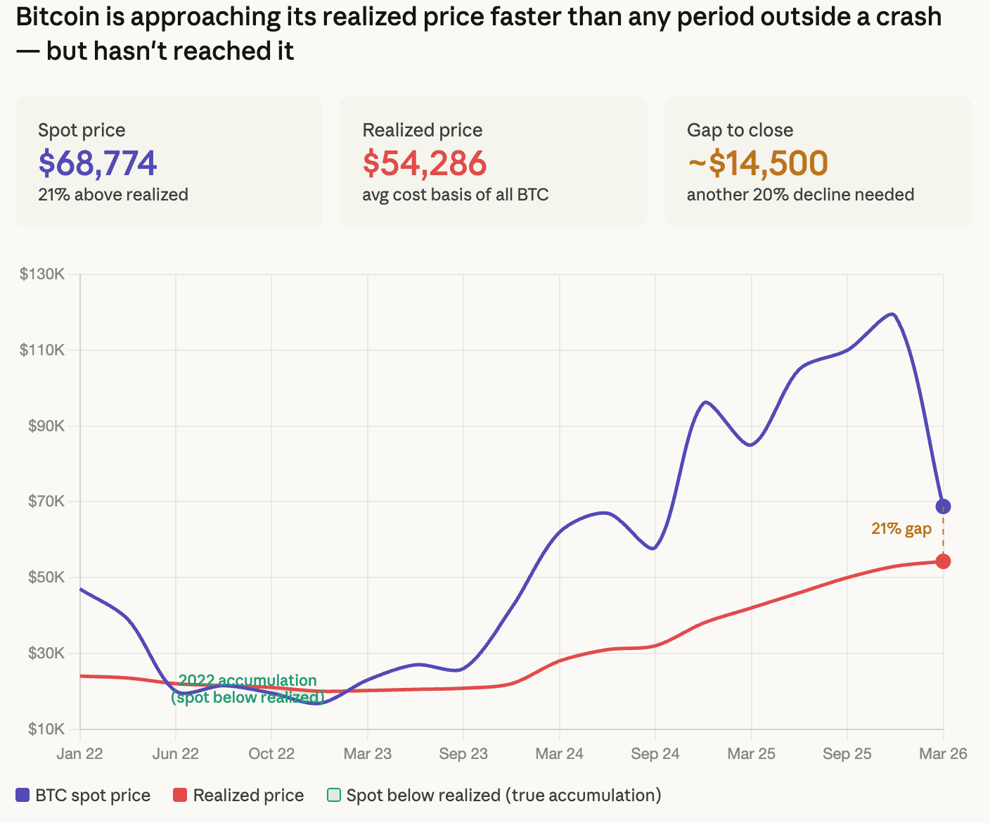 CryptoQuant-Daten zeigt den Realisierungspreis von Bitcoin, den durchschnittlichen Kostenbasiswert aller Coins im Netzwerk, gewichtet nach ihrer letzten Transaktion, der bei 54.286 USD liegt. Spot-Trades notieren auf demselben Chart bei 68.774 USD. Das ergibt eine Differenz von etwa 14.500 USD bzw. rund 21 % über dem Realisierungspreis.