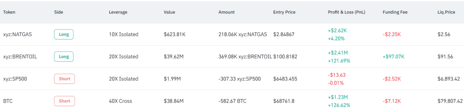 Doch damit nicht genug: Parallel ging der Wal auch eine Long-Position auf den Ölmarkt ein, mit 20-facher Hebelung. Auch diese Wette entwickelte sich in die richtige Richtung, da Ölpreise im Zuge der geopolitischen Spannungen deutlich anzogen. Hier beläuft sich der Gewinn bereits auf rund 2,41 Millionen US-Dollar.