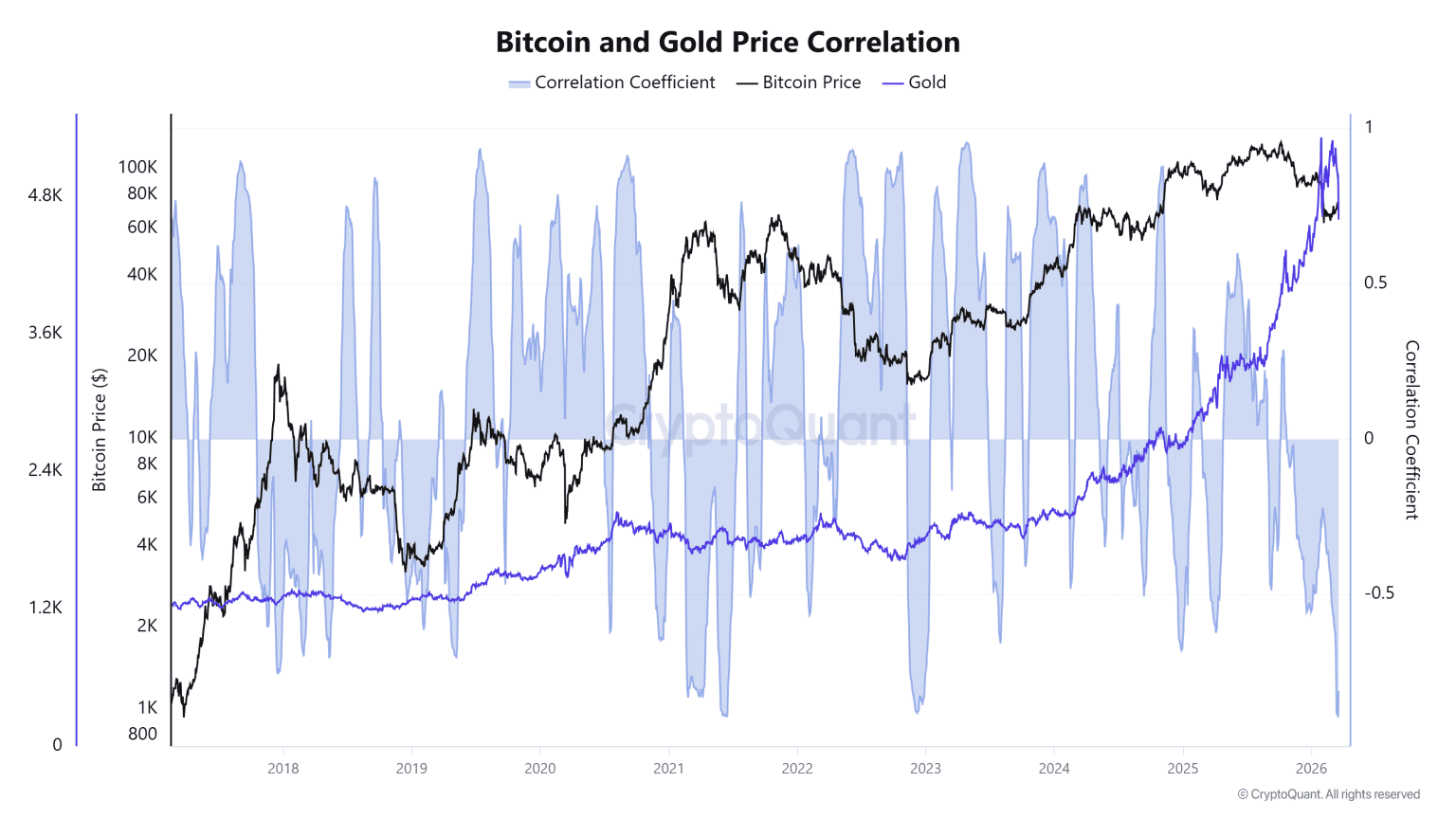 Bitcoin korrigierte von 126.000 US-Dollar Anfang Oktober auf zeitweise 60.000 US-Dollar Ende Februar, konnte die Marke von 70.000 US-Dollar im März aber mehrfach zurückerobern. Seit Monatsanfang befindet sich der BTC-Kurs auf Dollarbasis rund sieben Prozent im Plus, wohingegen Gold im selben Zeitraum 17 Prozent verloren hat. In der Konsequenz fiel der Korrelationsindex zwischen Bitcoin und Gold nach Daten von CryptoQuant auf -0,9, was den niedrigsten Stand seit mehr als drei Jahren bedeutet. Damals fiel die Krypto-Leitwährung vor dem Hintergrund des FTX-Kollaps auf rund 16.000 US-Dollar und markierte damit das finale Tief des berüchtigten Krypto-Winterjahres 2022.