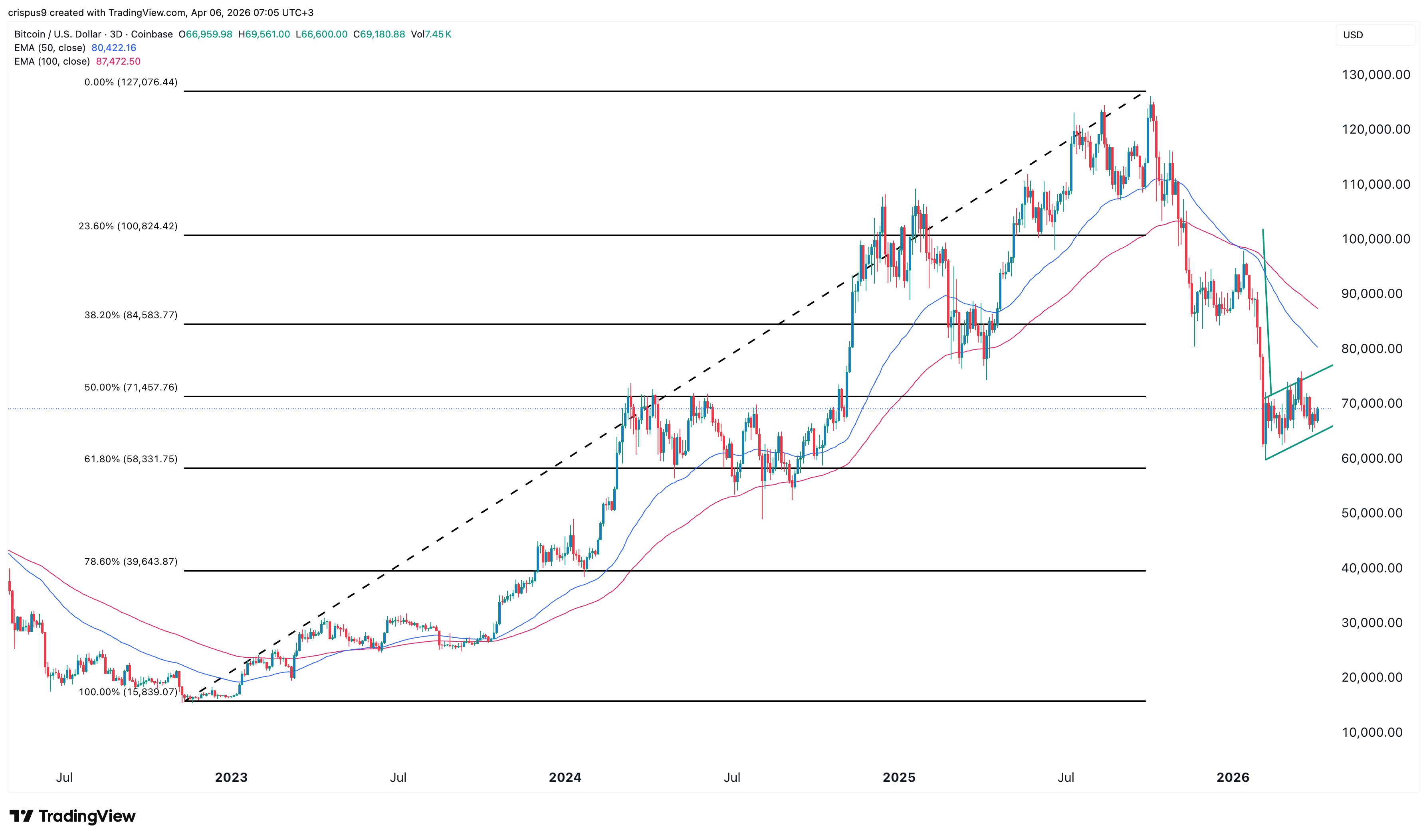 Bitcoin befindet sich weiterhin in einem Aufwärtskanal, der Teil der Ausbildung eines bearischen Flaggenmusters ist, ein häufiges Fortsetzungssignal in der technischen Analyse. Der Kurs blieb leicht unter dem 50%‑Fibonacci‑Retracement‑Level bei $71,457.