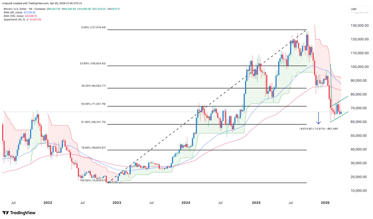 Der Wochenchart zeigt, dass Bitcoin kurz vor einem starken bärischen Einbruch stehen könnte, möglicherweise bis zur wichtigen Unterstützungsmarke bei 58.330 $.