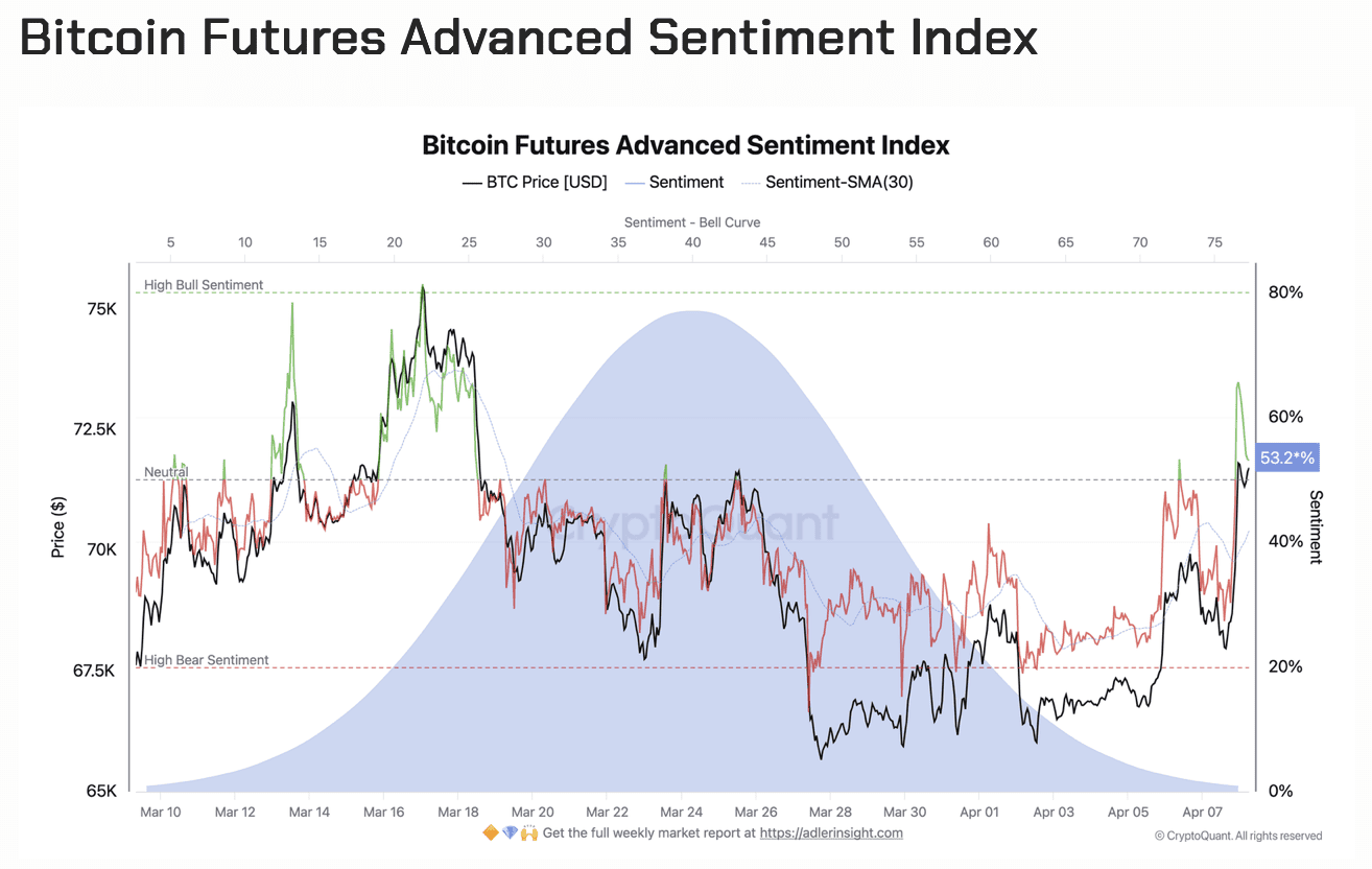 Der neue Optimismus ist vor allem auf dem Derivatemarkt sichtbar, wo hauptsächlich professionelle Händler aktiv sind. Ein Gradmesser für das Markt-Sentiment auf diesem Markt, der Bitcoin Futures Advanced Sentiment Index, schoss von 23,4 auf 53,1 nach oben, schreibt Analyst Axel Adler. Das zeigt, dass Händler deutlich positiver über die Aussichten sind.