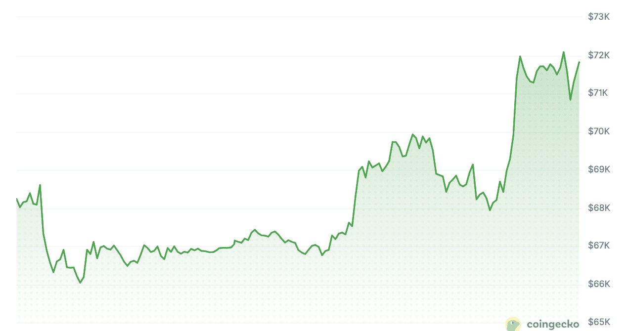 Am Mittwoch schoss der Bitcoin-Kurs plötzlich um mehr als fünf Prozent nach oben, über die Marke von 72.000 Dollar. Derzeit befindet sich der Kurs knapp darunter.