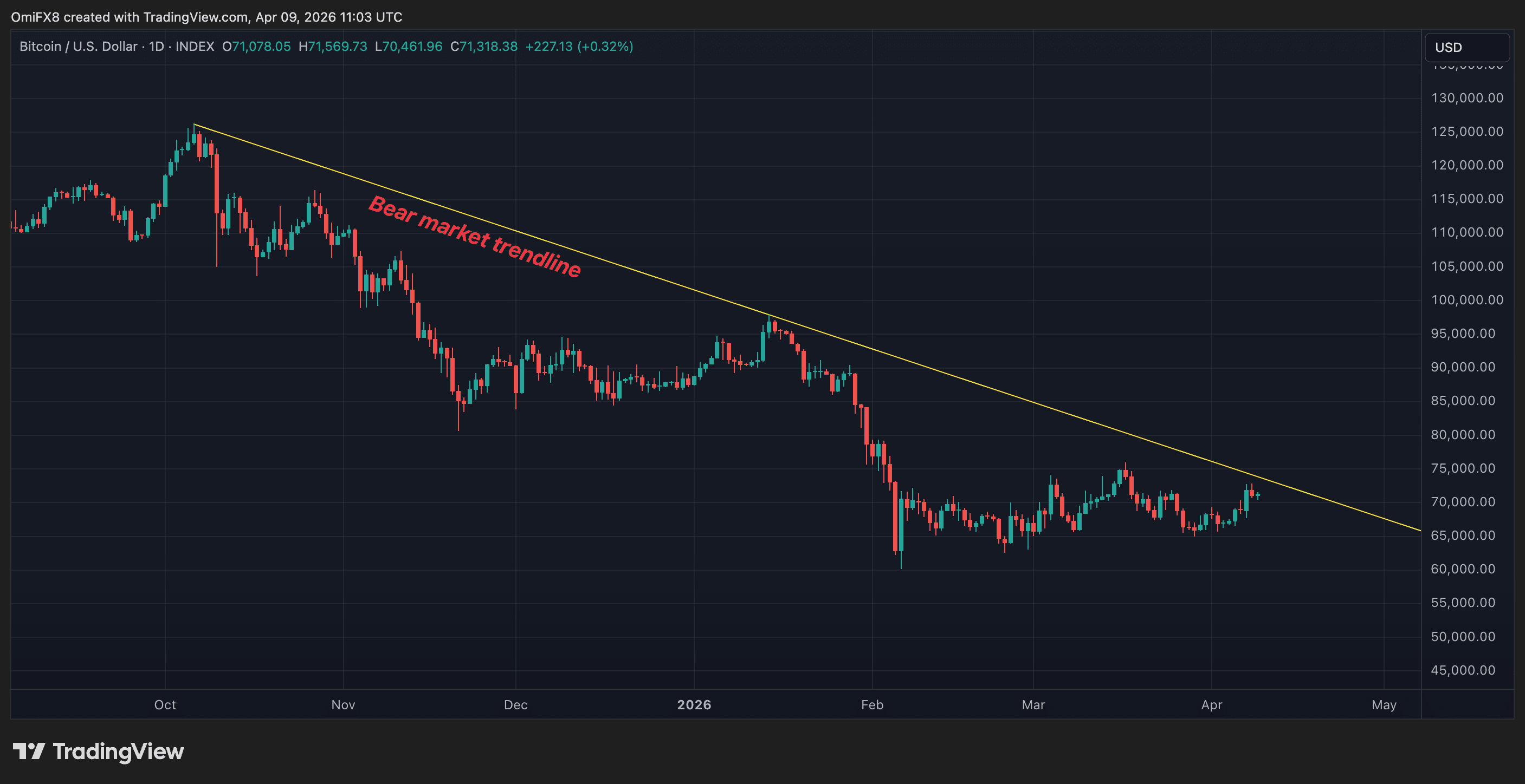 Andererseits würde eine Ablehnung an der Trendlinie diese als gültiges Widerstandsniveau bestätigen, was auf eine Fortsetzung des Bärenmarktes hindeuten würde. Dies würde das Risiko eines weiteren Rückzugs auf kürzlich erreichte Unterstützungsniveaus erhöhen, möglicherweise bis auf 65.000 US-Dollar oder darunter.