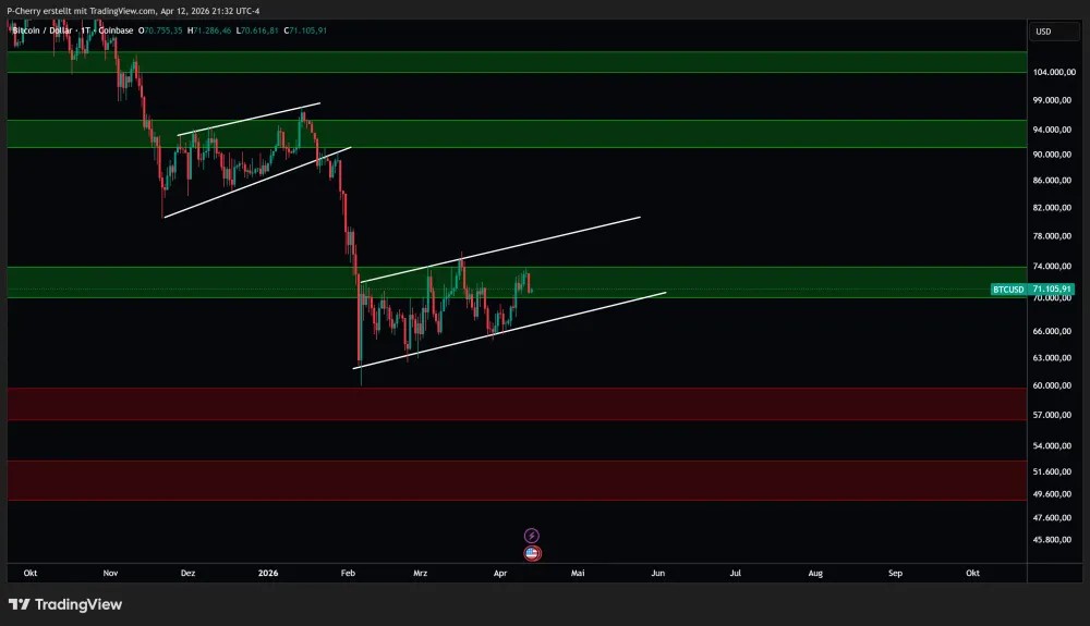 Der Bitcoin-Kurs zeigte zuletzt wieder Stärke und stieg auf über 73.800 US-Dollar an, scheiterte jedoch erneut an der strukturellen Widerstandszone. Im Chartbild ist ein Rising-Wedge-Pattern zu erkennen, das als bärisches Fortsetzungsmuster interpretiert wird.
