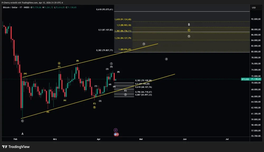 Der aktuelle Widerstandsbereich, der Welle B reicht vom 0,382er Fibonacci-Retracement bei rund 79.8000 US-Dollar bis zum 0,887er Fibonacci-Retracement bei rund 116.000 US-Dollar.