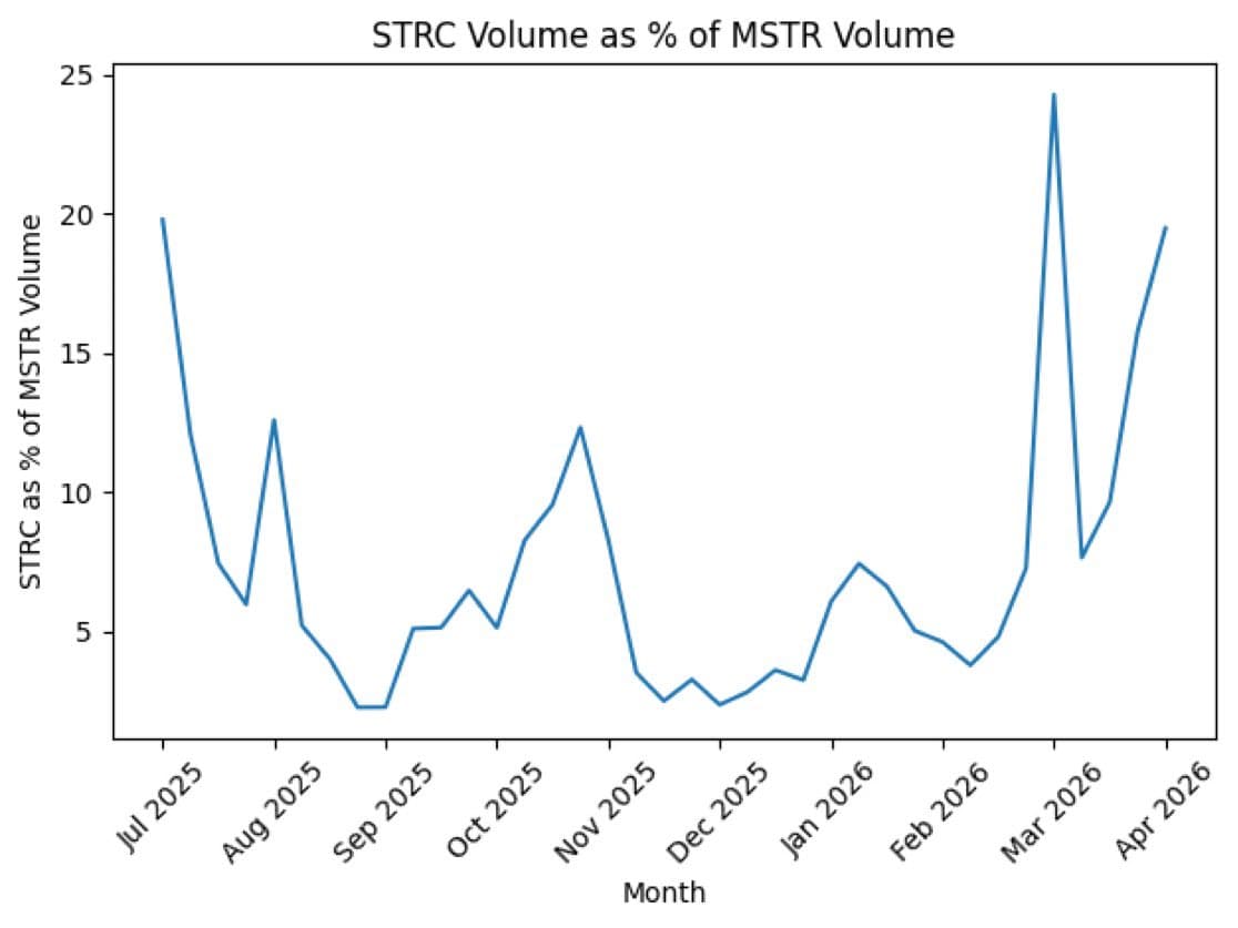 Das Handelsvolumen von STRC, das einst vernachlässigbar und im niedrigen einstelligen Bereich im Vergleich zu MSTR lag, ist auf etwa 20 % auf Wochenbasis angestiegen und hat gelegentlich Spitzenwerte von über 25 % erreicht. Laut dem MSTR-Dashboard wurde am Freitag MSTR im Wert von 1,7 Milliarden US-Dollar gehandelt, deutlich unter dem 30-Tage-Durchschnitt von 2,5 Milliarden US-Dollar, während STRC im Wert von 526 Millionen US-Dollar gehandelt wurde, etwa das Doppelte seines Durchschnitts von 259 Millionen US-Dollar und fast 50 % des MSTR-Volumens an einem einzigen Tag.