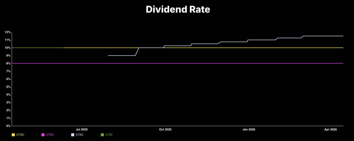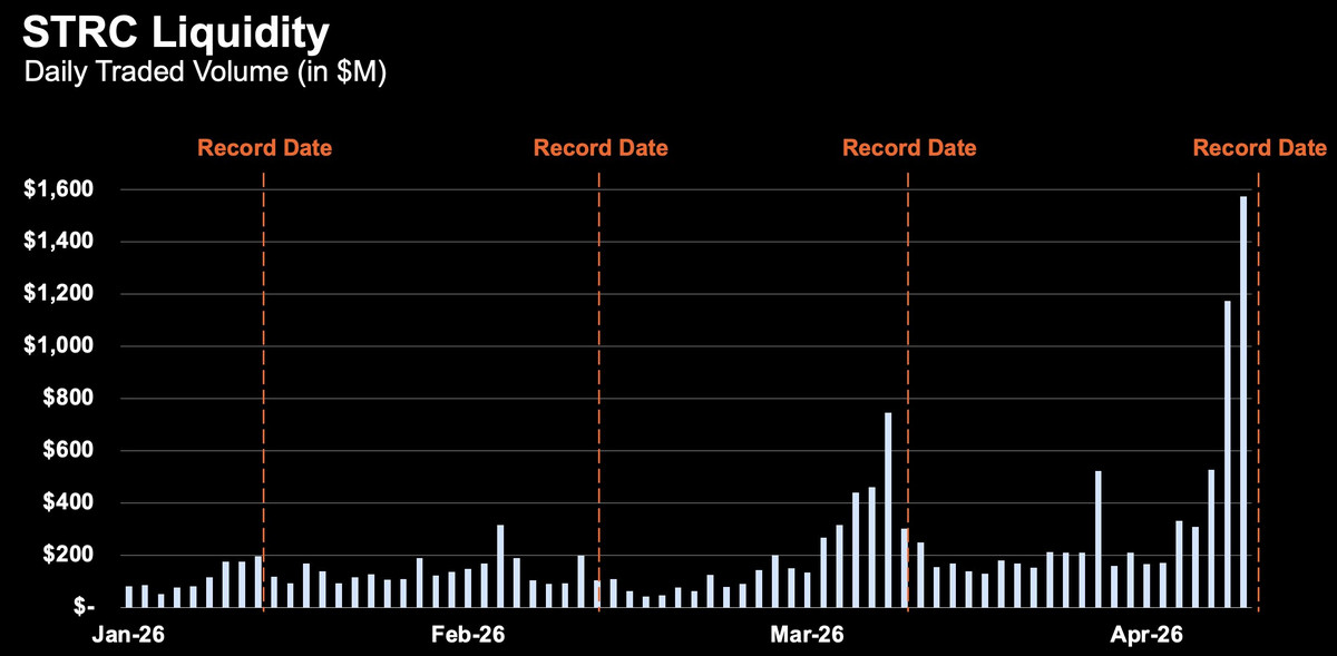 Mitte März gab es die bisherige Rekordwoche mit 1,18 Milliarden US-Dollar. In der vergangenen Woche waren es 1 Milliarde US-Dollar, während am Montag und Dienstag dieser Woche – den letzten beiden Handelstagen vor dem Ex-Dividend-Date – schätzungsweise wieder eine 7-stellige Summe über STRC eingesammelt wurde.