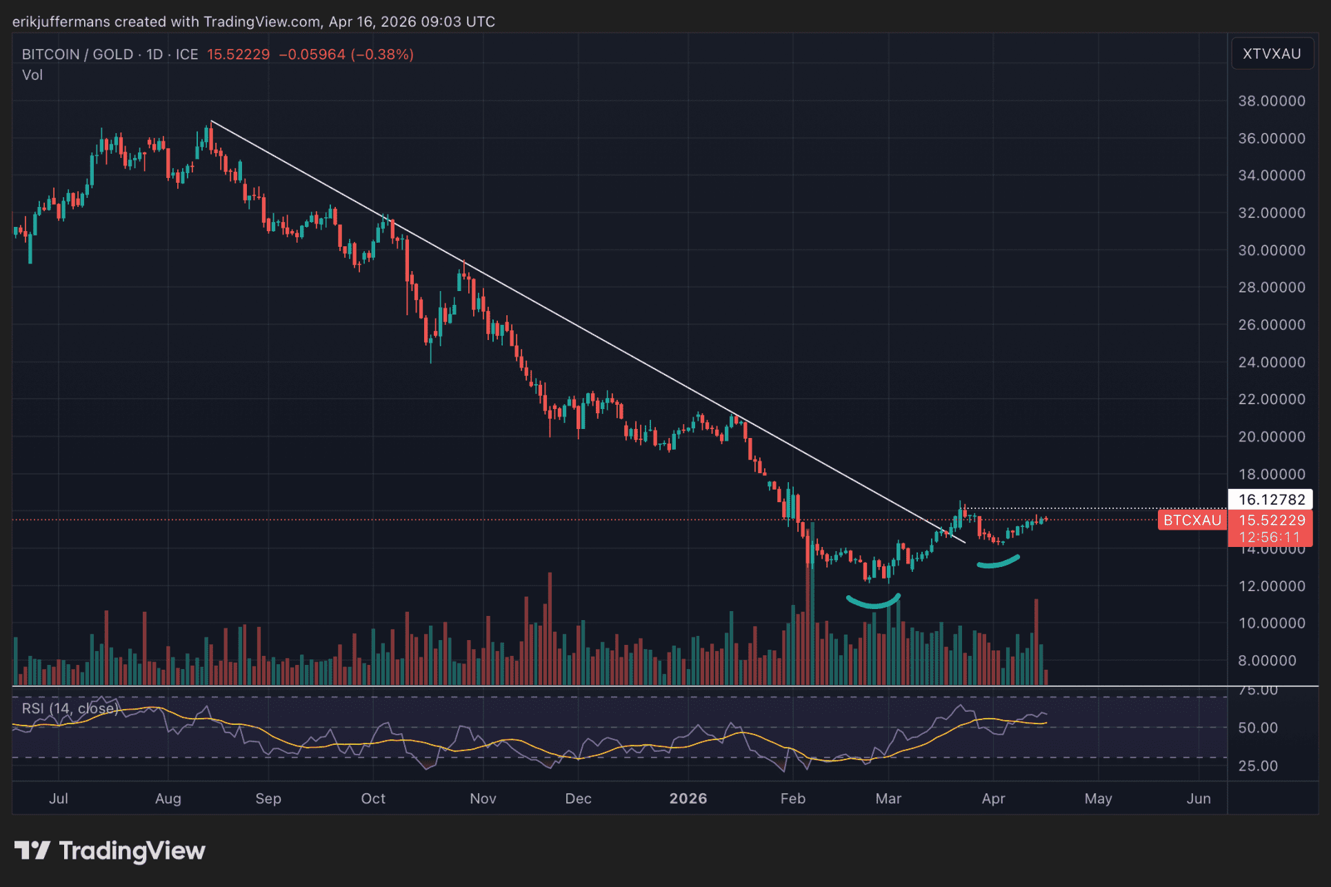 Die nachfolgende Grafik zeigt das Verhältnis $BTC/GOLD, also den Wert von $BTC in Unzen Gold. 1 $BTC entspricht derzeit etwa 15,5 Unzen Gold.