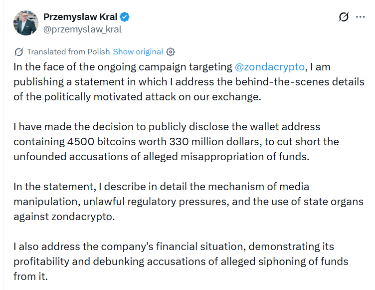 Przemysław Kral erklärt fehlende $BTC, Gründer und Ermittlungen. Quelle: @Przemysław_Kral über X/Twitter.