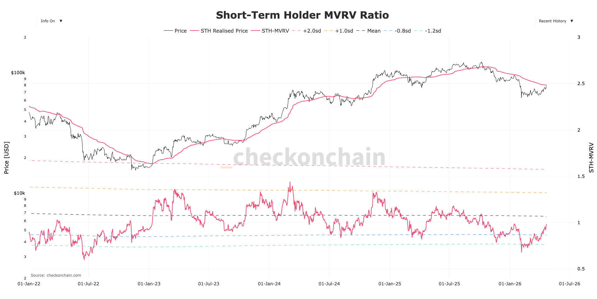 Direkt darüber liegt der Realisierungspreis der kurzfristigen Inhaber (STHRP) bei 79.200 US-Dollar, laut checkonchain. Diese Kohorte, definiert als Investoren, die Coins weniger als 155 Tage halten, neigt dazu, stärker auf Preisschwankungen zu reagieren. Da die Spotpreise unter ihrem durchschnittlichen Einstieg liegen, bleiben diese Teilnehmer mit einem leichten Verlust. Bitcoin testete den STHRP Mitte Januar bei etwa 98.000 US-Dollar und wurde abgewiesen.