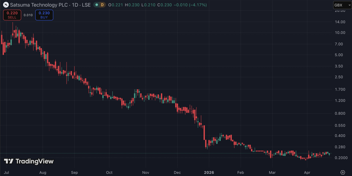 Satsuma Technology ist eine von vielen neueren „Bitcoin Treasury Companies“, die alles andere als einen guten Start hinlegen konnte. Am 17. Juni 2025 gab das Unternehmen bekannt, von nun an eine Bitcoin-Strategie zu verfolgen. Seit dem im Sommer 2025 erreichten Hoch ist die Aktie schließlich rund 99 % gefallen.