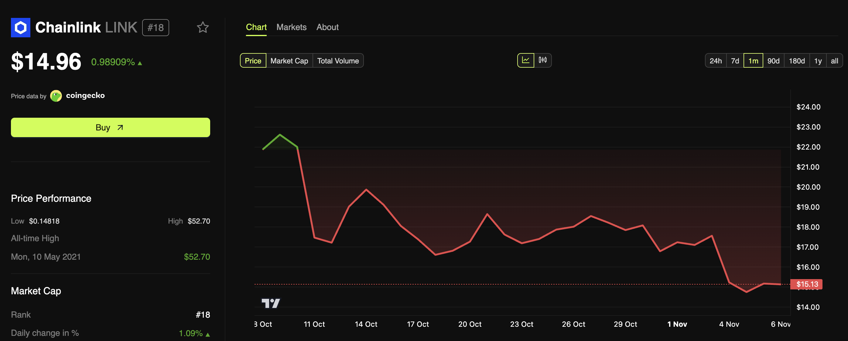 Bei Redaktionsschluss wurde LINK bei 14,96 USD gehandelt, was eine bescheidene Erholung von fast 1 Prozent in den letzten 24 Stunden bedeutet.