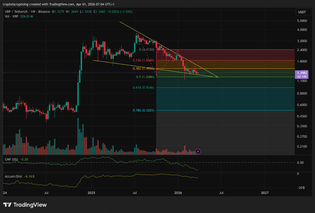Andererseits zeigt der Akkumulations-/Verteilungsindikator im Wochenchart einen allmählichen Ausverkauf gegenüber den Höchstständen von 2025. Der Chaikin-Geldfluss (CMF) zeigt, dass mit sinkenden Preisen auch Geld aus $XRP herausfloss.