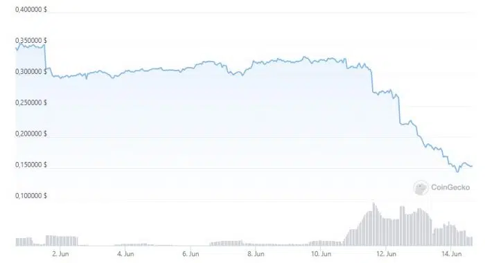 Wie wir bereits wissen, folgte am 11. Juni mit dem Durchbruch der Widerstandslinie die Fortsetzung des langfristigen Abwärtstrends. Dennoch können wir erwarten, dass DeFi Coin bei 0,27 $ auf Unterstützung treffen dürfte, sollte er die Trendwende schaffen.