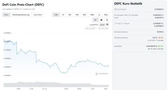 In den letzten 24 Stunden (Stand: 14. Juni 2022, 11 Uhr) fiel der Kurs von DeFi Coin zunächst von 0,18 $ auf 0,14 $, bis sich um 4 Uhr eine Trendwende durch die Kurssteigerung auf knapp 0,16 $ anbahnte. Aktuell notiert DEFC bei einem Wert von 0,157 $.