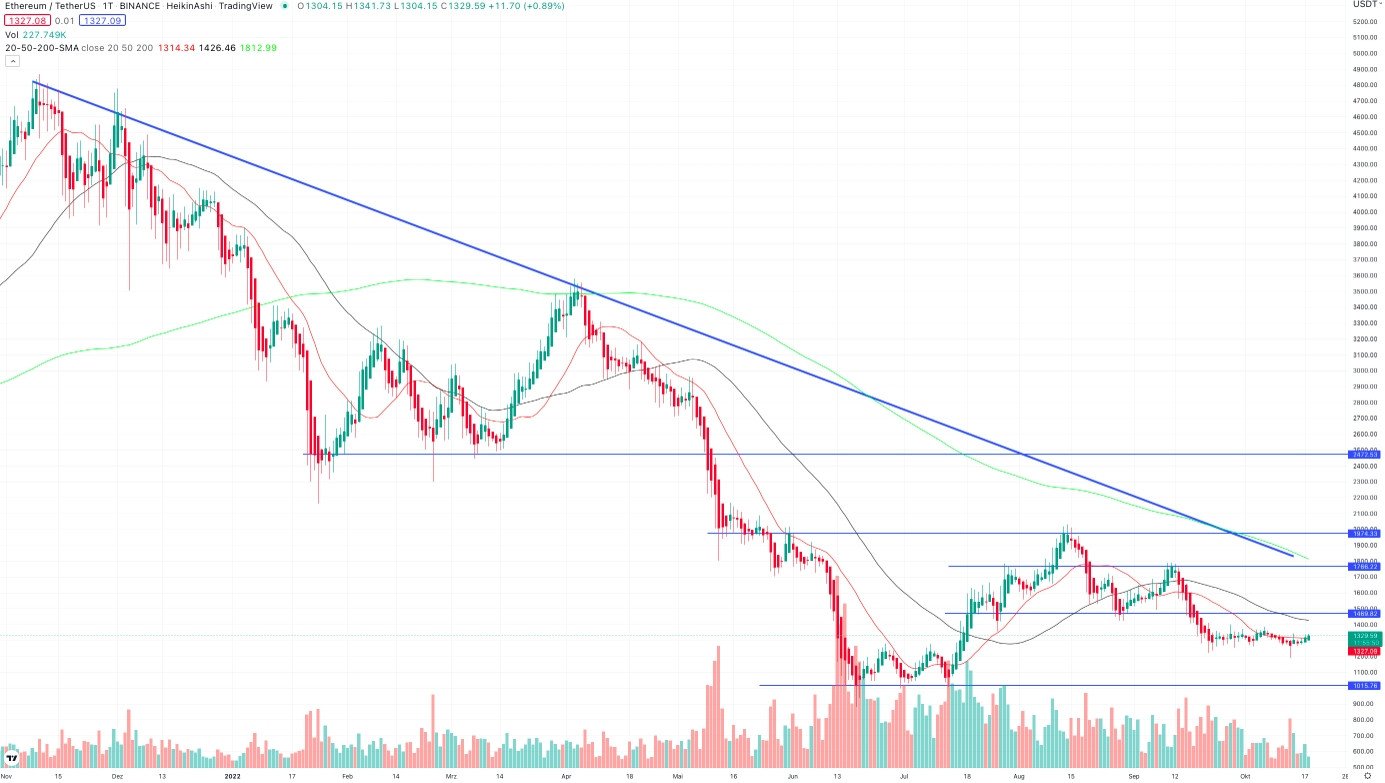 Kurzfristig bewegt sich ETH in einem charttechnischen Niemandsland. Der langfristige Abwärtstrend ist intakt. Der Tages-Chart offenbart theoretisch Raum für einen Rücksetzer bis auf 1015 $. Demgegenüber müsste ETH zunächst erneut im ersten Schritt die 1490 $ überwinden, um die Stimmung aufzuhellen. Bei rund 1800 $ bewegen sich aktuell der SMA 200 auf Tagesbasis und der langfristige Abwärtstrend, ausgehend vom ATH im November 2021. Ein Erreichen dieses Kursniveaus könnte eine nachhaltige Trendwende für Ethereum bedeuten.