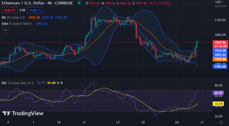 Die stündliche Preisanalyse Ethereum ist erneut gesunken, da die Bullen in den letzten vier Stunden einen Anstieg verzeichneten. Der BTC/USD-Wert stieg auf 1.948 $, nachdem die grünen Kerzen wieder auf dem Kurschart erschienen. Der Markt hat eine bullische Rendite erzielt, nachdem der Preis drastisch gefallen war und die Bullen wieder in den Markt eingetreten sind.